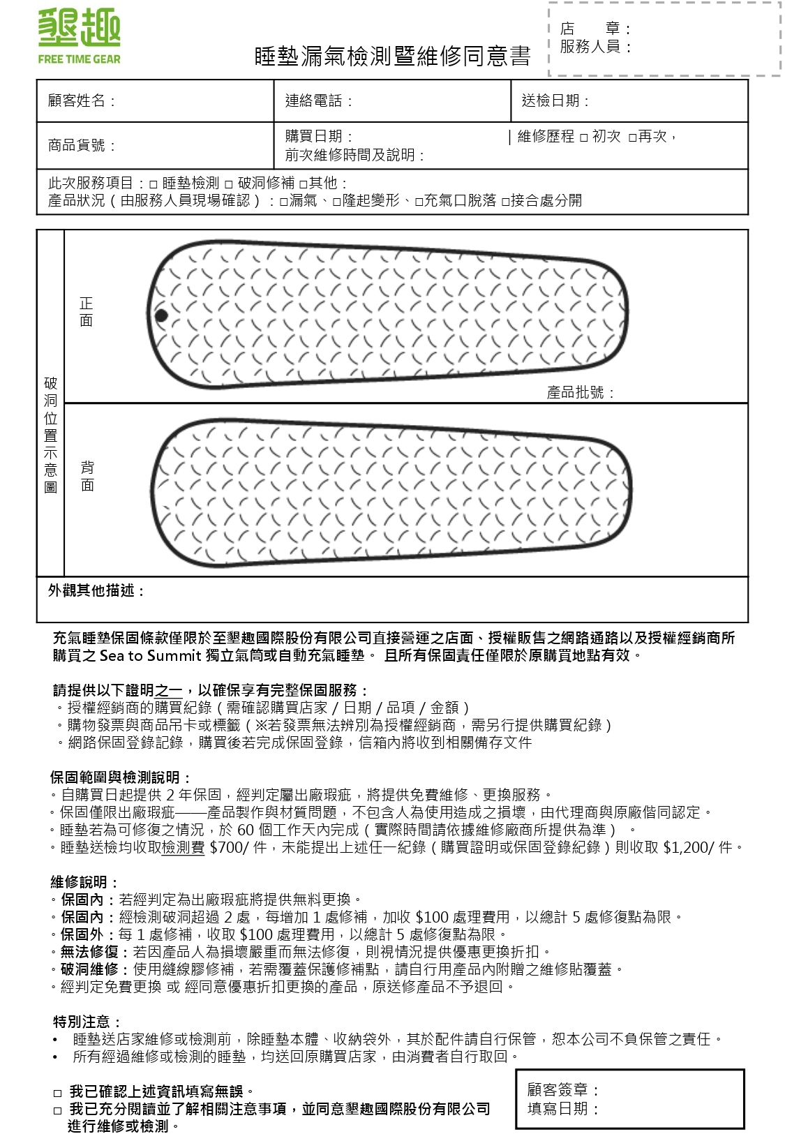 ➢ 商品維修後外觀會與既有產品有差異,請謹慎考慮是否要進行維修,若同意維修均需檢附睡墊漏氣檢測暨維修同意書。